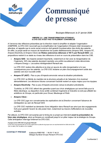 COMMUNIQUÉ DE PRESSE – AMPERE 2.0 : UNE TRANSFORMATION ATTENDUE Actualités, Communiqué de presse, Nos tracts Publié le 21 Jan 2026 CFE-CGC Renault Group