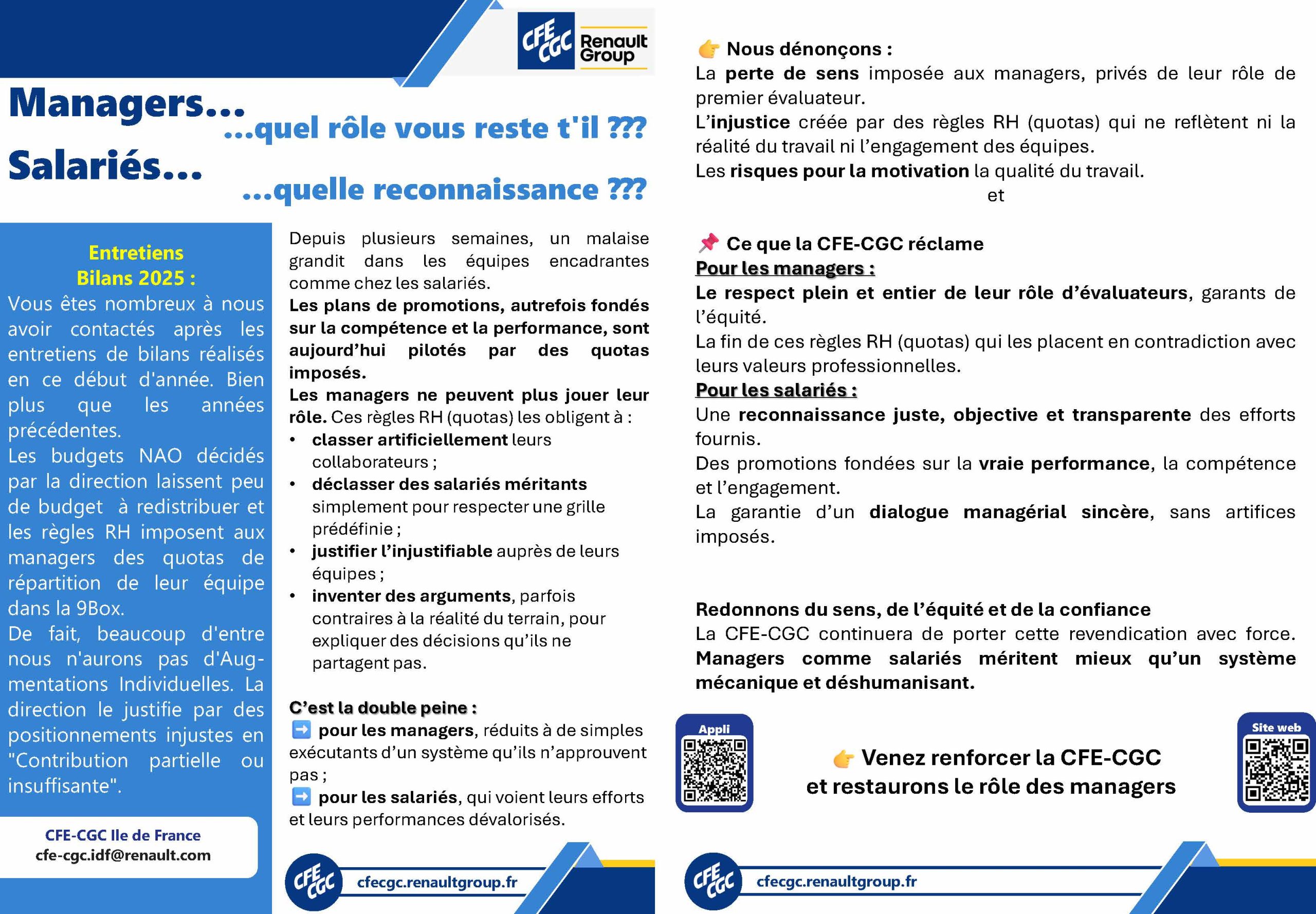 Entretiens Bilan 2025 – La double peine Tracts Ile de France Publié le 5 Mar 2026 Managers, quel rôle vous reste t'il ??? Salariés, quelle reconnaissance ??? Téléchargez Imprimer CFE-CGC Renault Group